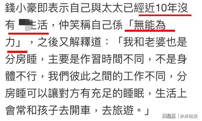 活动期间,钱小豪在接受媒体采访时透露与妻子丘倩鸣的婚姻现状,自曝与老婆已有近10年时间没有夫妻生活笑称自己无能为力。